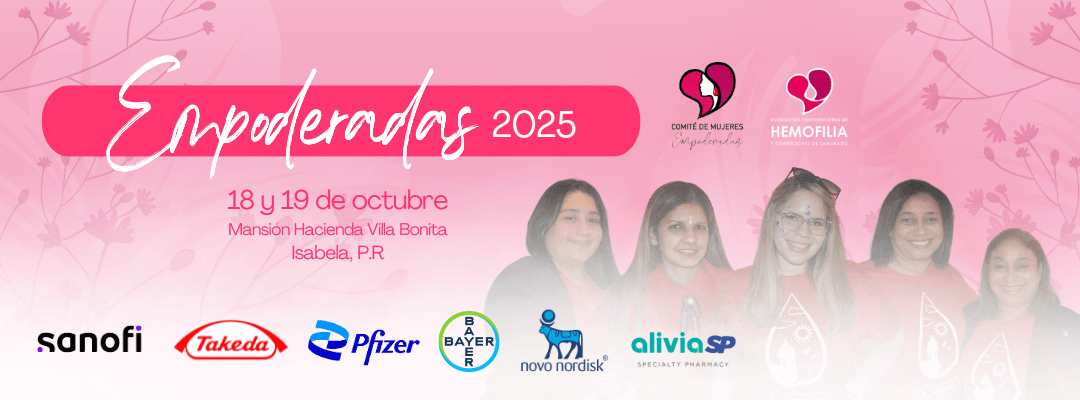 Vuelve la conferencia más esperada para la mujer de nuestra comunidad: “Empoderadas 2025". Este evento educativo será de dos días y se llevará a cabo los próximos 18 y 19 de octubre de 2025 en Mansión Hacienda Villa Bonita, Isabella P.R. El mismo está dirigido exclusivamente a pacientes féminas, portadoras y cuidadoras de la comunidad de condiciones de sangrado.